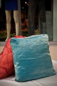 White Satin Ottoman Cover, Orange Pintuck Pillows, Turquoise/Gold Crush Pillows
